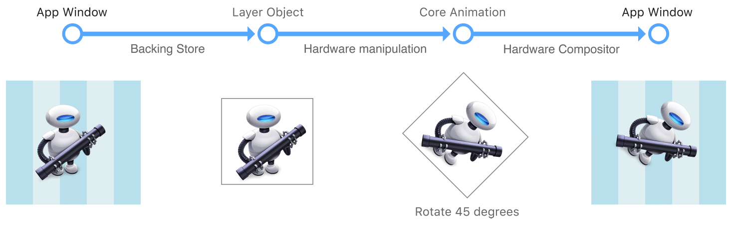 - 변경으로 인해 애니메이션이 트리거 되면, Core Animation은 레이어의 비트맵과, 상태 정보를 그래픽 하드웨어에 전달