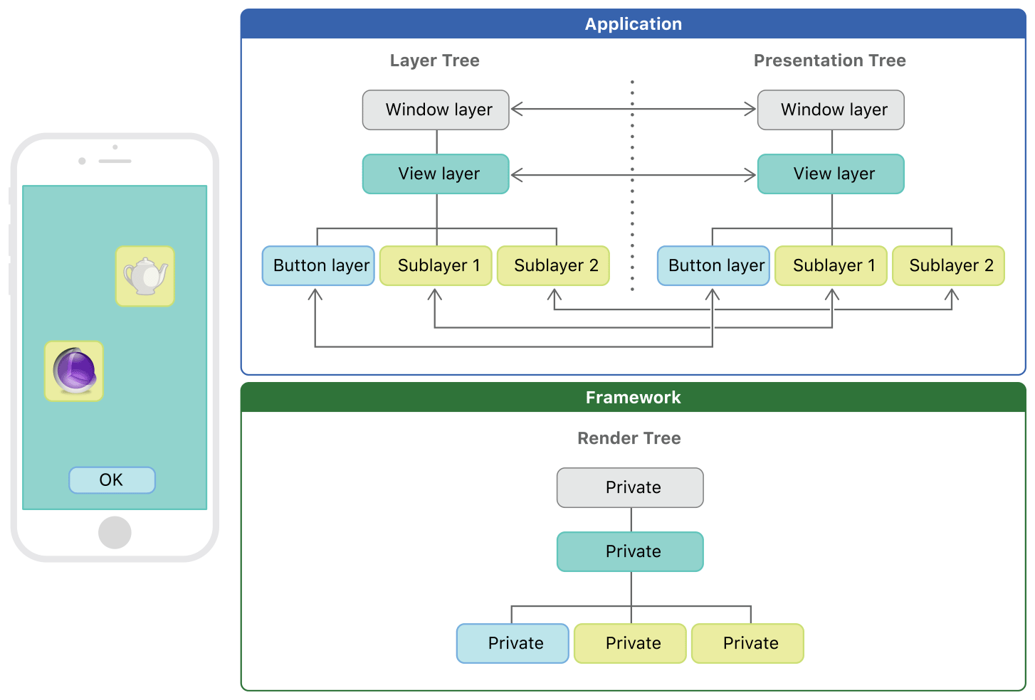 - Core Animation을 사용하는 앱(거의 모든 앱)은 3가지 layer 객체 세트가 존재