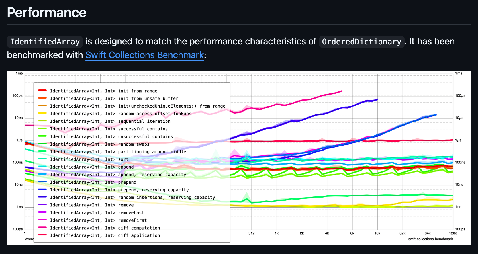 - Github README에서는 성능이 Swift의 OrderedDictionary 성능과 일치한다고 주장합니다😃